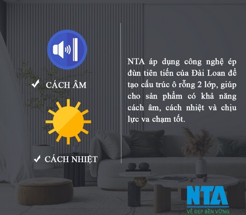 Sản phẩm tấm ốp nhựa NTA sử dụng công nghệ ép đùn tiên tiến của Đài Loan để tạo cấu trúc ô rỗng 2 lớp. Cho khả năng cách âm, cách nhiệt và chịu lực va chạm tốt.