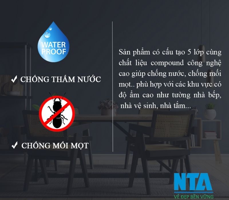 Tấm ốp NTA có cấu tạo 5 lớp cùng chất liệu Compound công nghệ cao giúp chống nước. Chống mối mọt, phù hợp với các khu vực có độ ẩm cao như nhà tắm, nhà vệ sinh, nhà bếp..