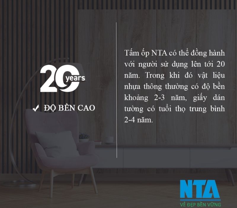 Không giống với những sản phẩm khác trên thị trường. Tấm ốp NTA có thể đồng hành cùng với người sử dụng trong thời gian dài lên tới 20 năm. Thời gian này đối với vật liệu nhựa thông thường là 2-3 năm. Giấy dán tường có tuổi thọ trung bình 2-3 năm và không chịu được nước.